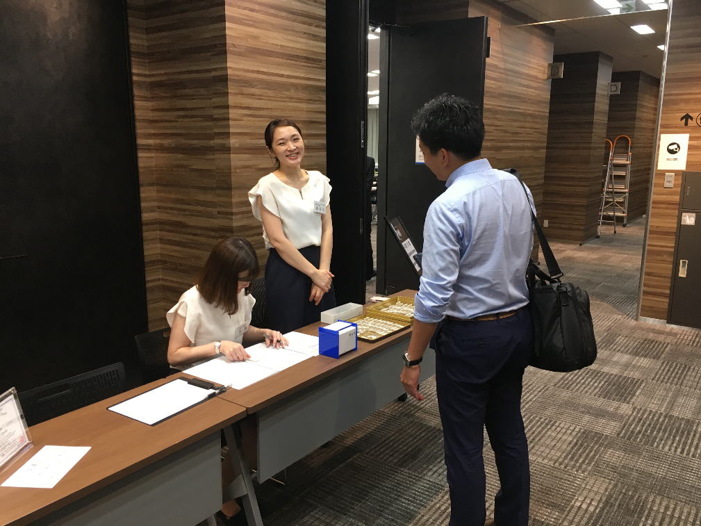 定刻の20分程前から皆様の参集が始まりました。皆様猛暑の中ご参加いただきありがとうございました。受付では名刺をいただき名札をお渡しします。