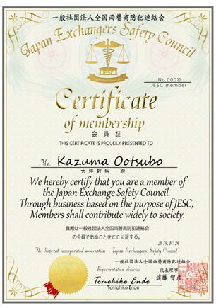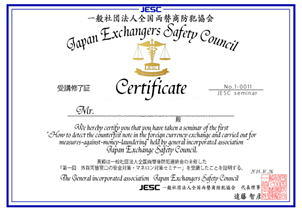 会員証はJESC会員になると、原則として1事業所に1枚発行されます(追加増刷可能)。いわゆる「certificate」として、両替窓口に配置すると抑止効果が得られる可能性があります。箔押しA4判(210×297o)サイズです。