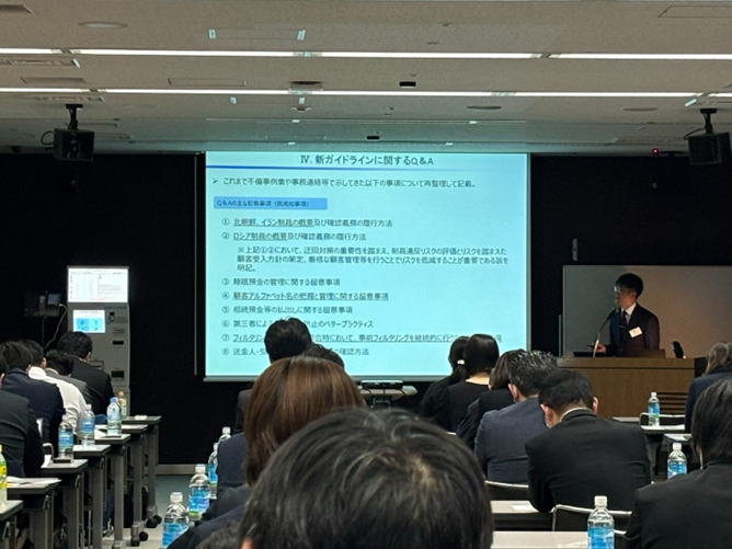 冒頭は、財務省国際局外国為替室 梶浦猛成様による講演で、2024年4月施行の改正外為法について、拡散金融に係るリスクベース・アプローチ、内部管理態勢、リスク低減措置等ガイドライン改正に関する基本的な考え方、遵守規定等について解説をいただきました