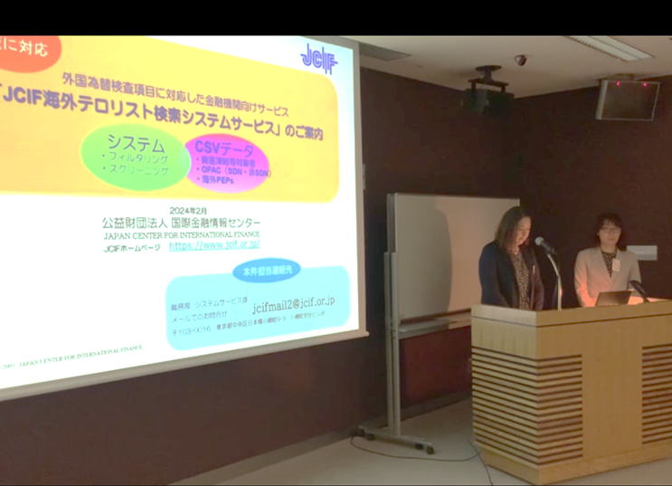 次のテーマは、マネロン・テロ資金供与対策に関するサービスについて、制裁対象者のデ―タベースあるいは検索エンジンを提供する国際金融情報センター(JCIF) グローバル金融犯罪リスク分析支援部の井上康江様、武田育美様による「外為法等に基づく経済制裁規制に関する情報提供サービスとして@制裁対象者のフィルタリング、A制裁対象者リストの整備、B制裁対象者リストの追加的登録に関するシステムを提供」するとのことです。